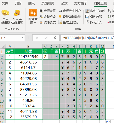 8、将C2:M2区域公式向下填充,即可完成所有金额拆分