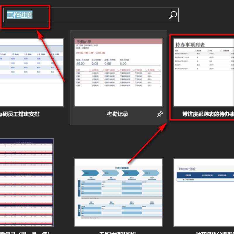 3、搜索框内,输入工作进度关键词,选择对应的工作表