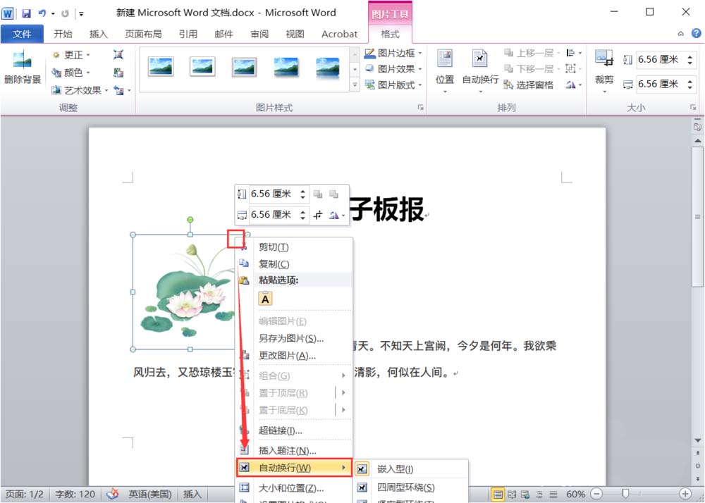 5、鼠标右键“自动换行”-“四周环绕型”。