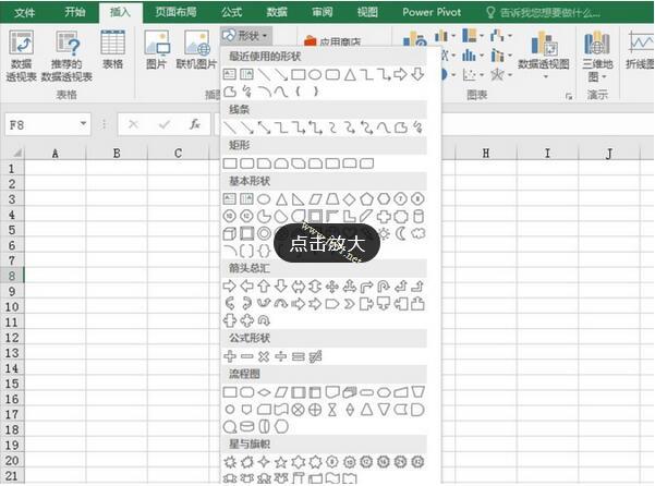1.新建一个Excel表格,点击菜单栏的插入——形状,根据你想画的内容来选择形状,