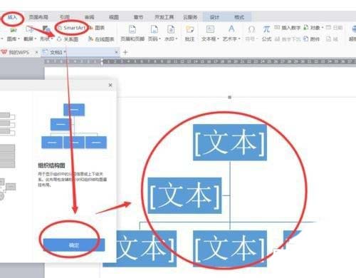 1、打开WPS文字,新建一个空白文档。点击左上角菜单“插入”,选择“SmartArt”功能,在模板里选择想要的结构图模型,点击确定。