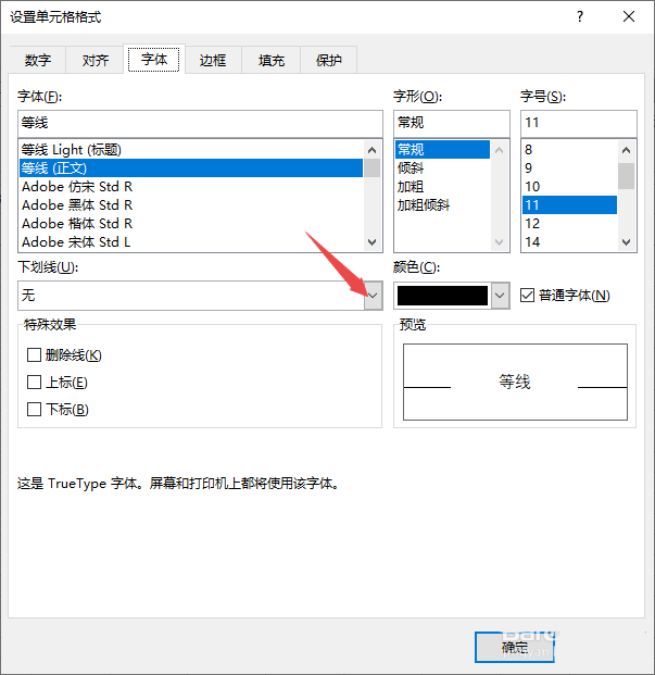 5、然后点击下划线边上的下拉箭头;