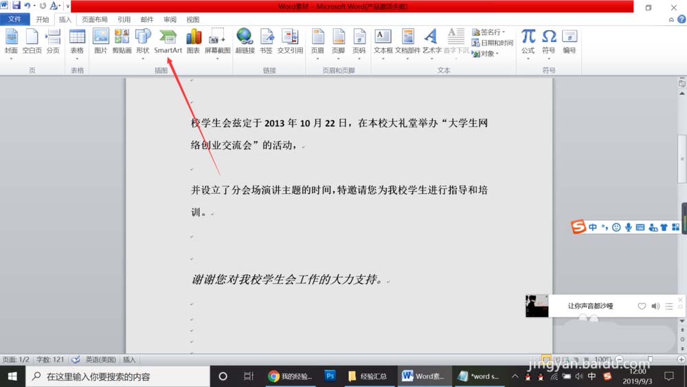 3、点击插入,找到插入选项卡下面的插图功能组,在里面找到smart art图形,点击进入,如下图所示。