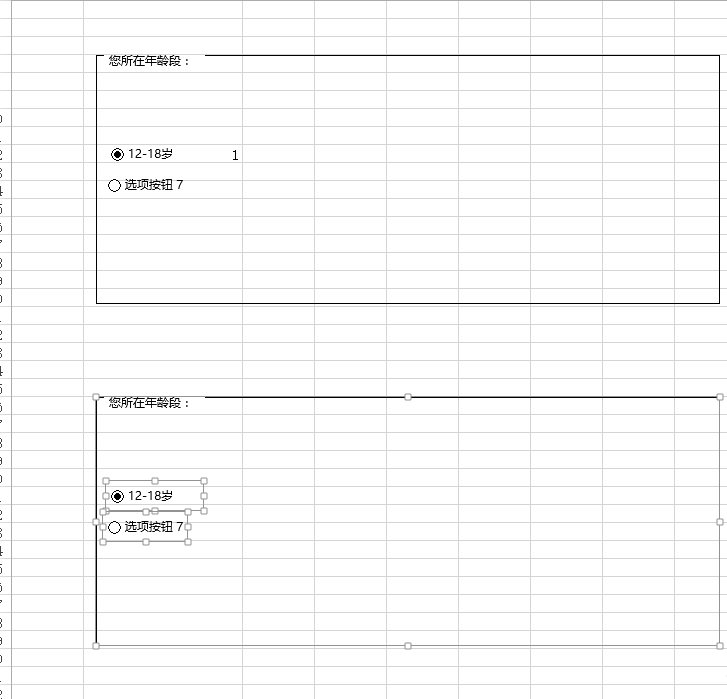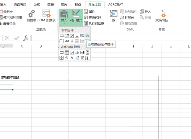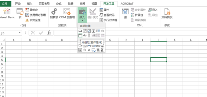2、在开发工具中找到“插入-控件-分组(窗体)控件”在单元格中添加即可