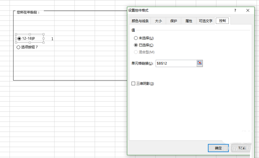4、设置选项按钮:右键选择选项按钮-修改文字,为了能给快速统计选项答案可对其设置控件格式-“控制”在单元格链接中可输入调查问卷之外空白单元格作为统计