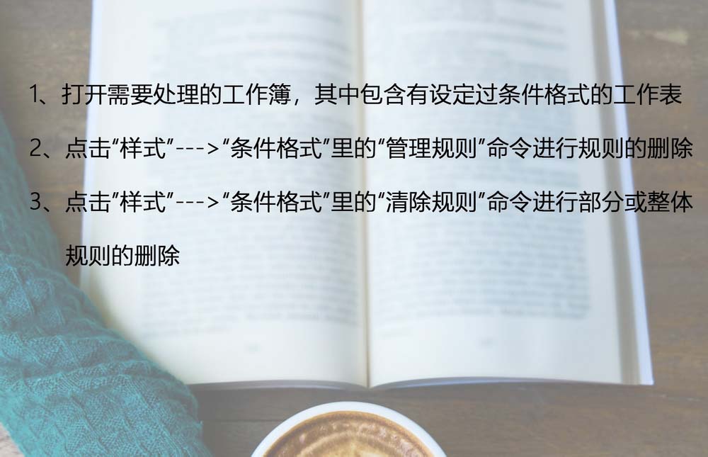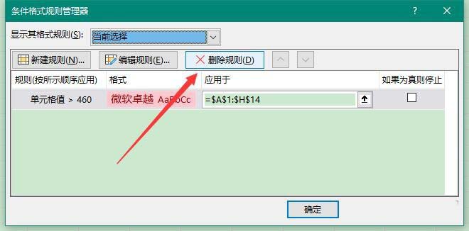 3、通过“开始”选项卡里的”样式“--->”条件格式规则管理器“,利用”删除规则“命令,对选中的规则进行删除