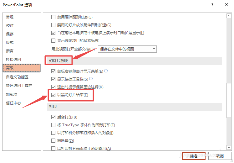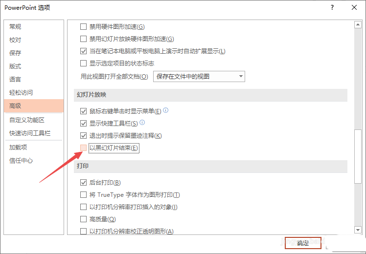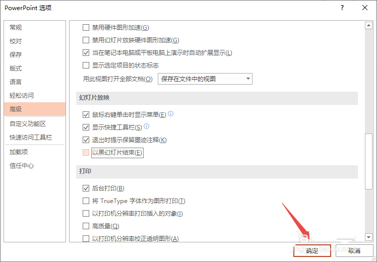 7、最后,我们点击确定即可。这样就不会以黑幻灯片放映结束了。