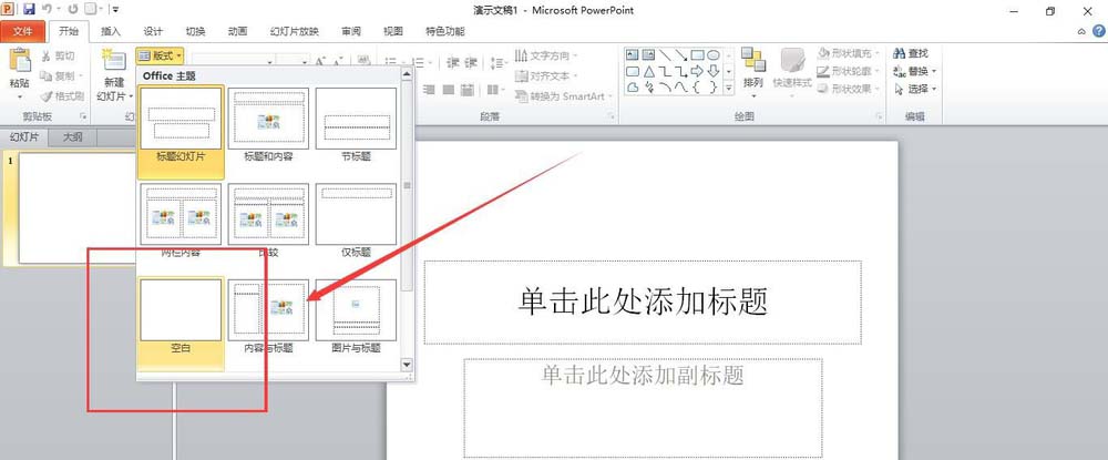 2、在PPT版式里面选择空白版式做为幻灯片。