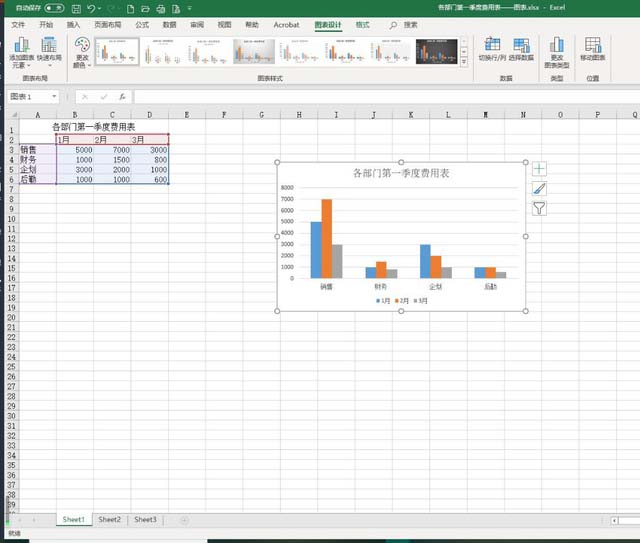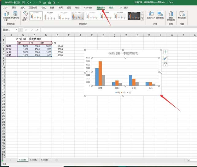 3、选中图表,点击菜单栏中的“图表设计”