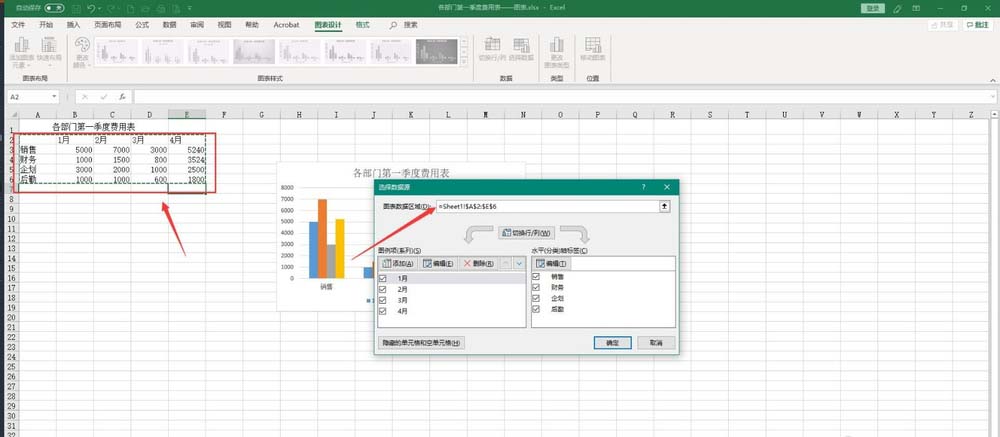 5、选择A2:E6单元格区域,点击确定,这样添加的4月数据就绘制到图表中了