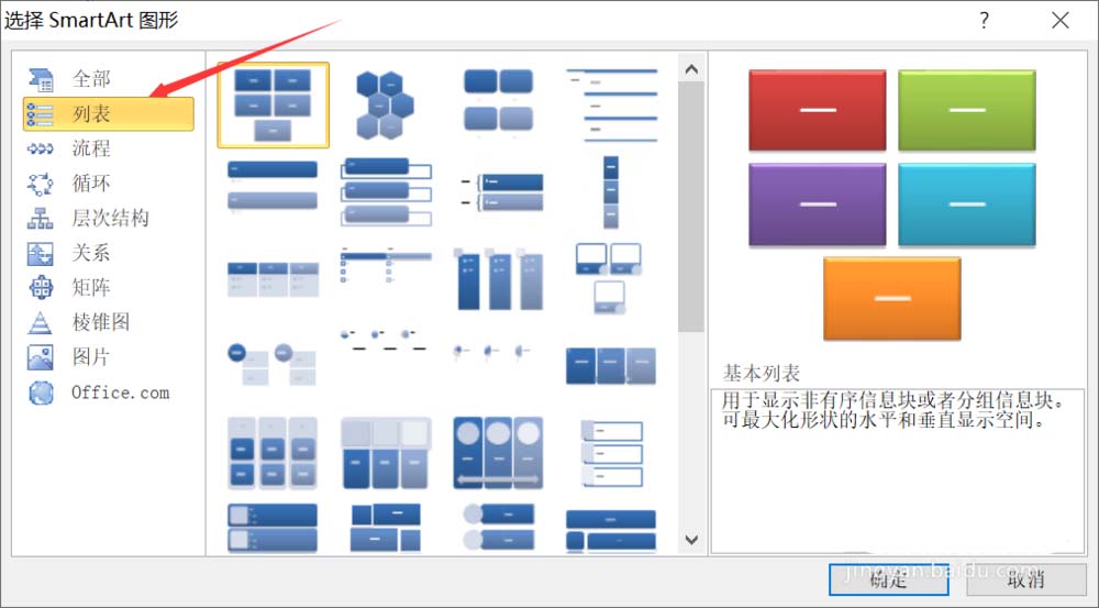 4、弹出来的smartart对话框里面找到列表选项,如下图所示。