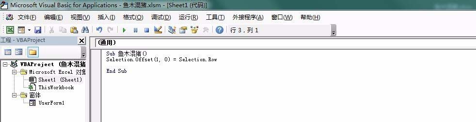 3、下面代码是得到当前单元格的行号并放到当前单元格下一个单元格中: