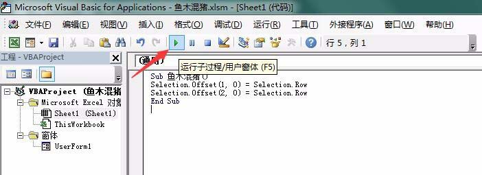 5、代码编写完成,点击运行子过程按钮(或按下F5),如下图所示: