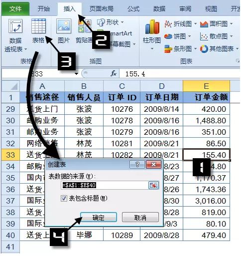 步骤1:单击数据区域任意单元格,依次单击【插入】,【表格】。弹出【创建表】对话框,保留默认选项,单击【确定】。