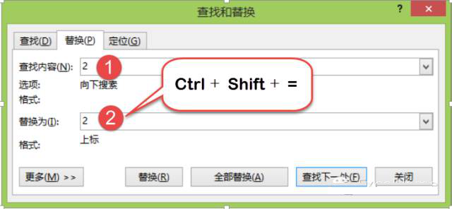 替换栏中输入2,按【Ctrl+Shift+=】快速切换为上标。然后点击全部替换。