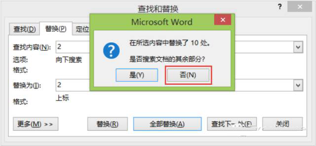 点击【全部替换】后弹出新的对话框,询问“是否搜索文档其余部分”,注意一定选择【否】,否则,文档里表示数字的2也会被替换为上标状态哦。