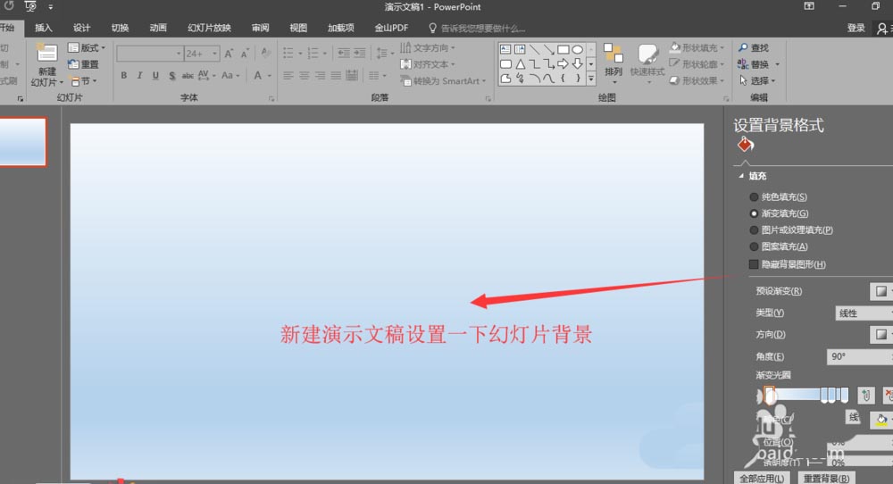 1、创建一个新的PPT演示文稿,然后设置幻灯片页的填充效果,设置一个渐变的填充颜色。