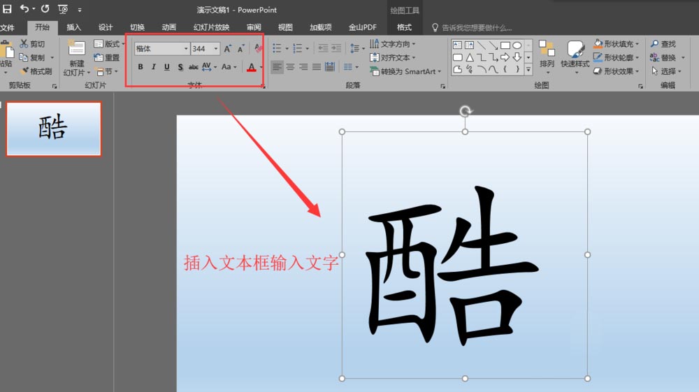 2、插入一个文本框,在文本框中输入一个文字,然后在文字格式中设置文字的大小与字体等。