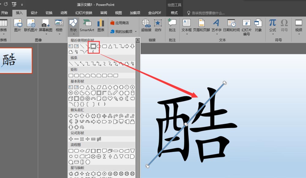 3、通过插入菜单插入一个矩形条出来,将绘制的矩形条进行旋转操作,并将旋转后的矩形条放到文本框文字的上面。