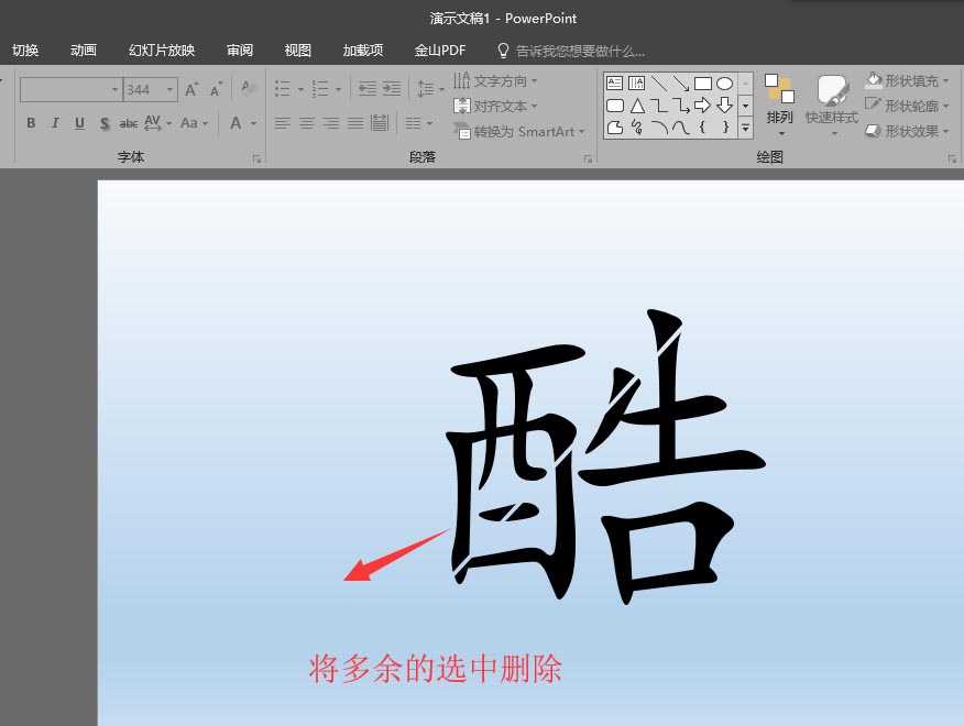 5、执行过拆分之后,用鼠标单击选中多余的部分,将多余的部分按delete键删除掉,只留下文字。