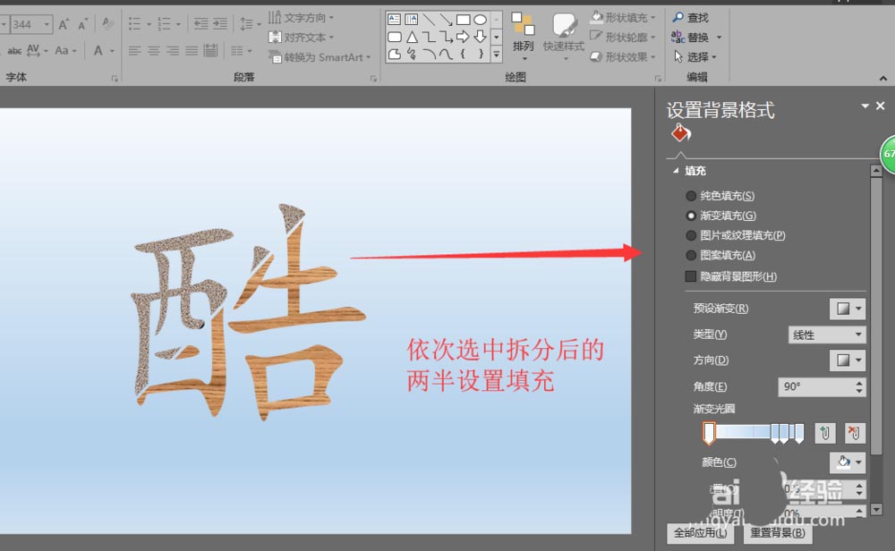 6、依次选中拆分为两半的文字,设置填充效果,为其填充不同的颜色或图片与纹理等效果。就可以完成我们最终的炫酷文字的制作。