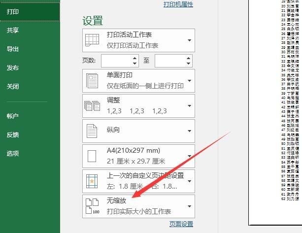 3、然后在右侧的打印预览设置属性窗口中,我们点击对下面的菜单项设置为无所放即可