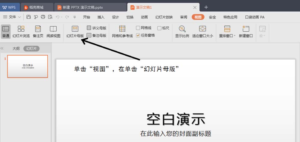 1、新建一个空白的PPT,单击菜单栏的“视图”,再单击“幻灯片母版”。
