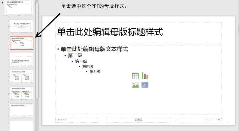 2、进入“幻灯片母版”页面,单击第三个PPT母版样式。