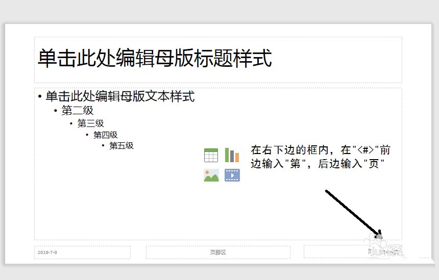 3、在母版样式页面右下角的页面框内,在"<#>"前面加 “第”,后面加“页”。