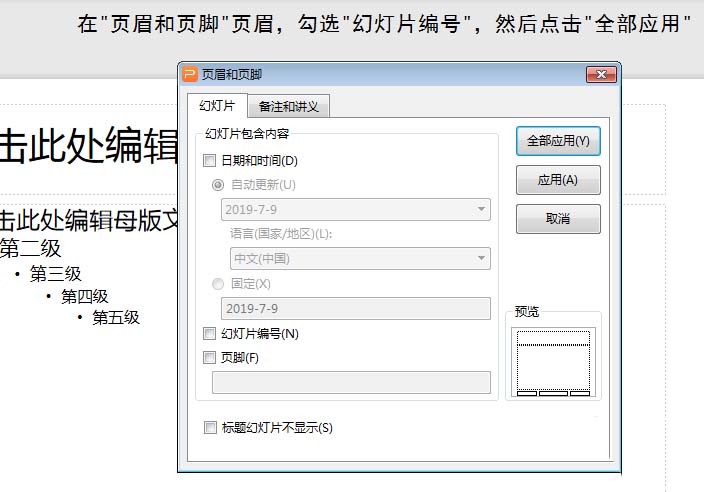 5、在弹出的“页面和页脚”页面上,勾选“幻灯片编号”,然后单击“全部应用”。