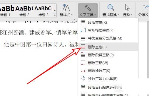 5、在弹出的下拉菜单中点击删除空段的菜单项