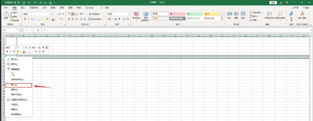 2、在第七行的位置插入一行,就点击第七行,然后点击右键,出现“插入”命令,点击后就可以在第七行的地方插入一个新的行