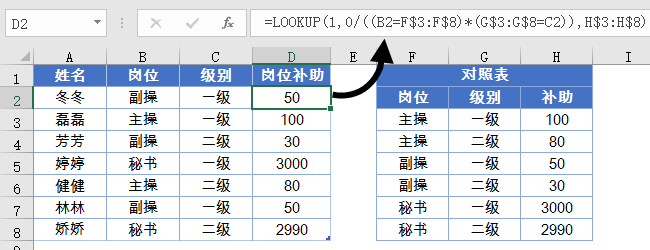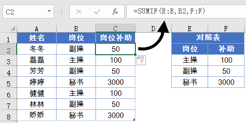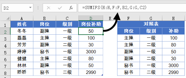这里咱们同样利用对照表中都是唯一记录的特点,所以用SUMIFS按岗位和级别两个条件求和,得到的结果就是不同岗位、不同级别的对应补助记录。