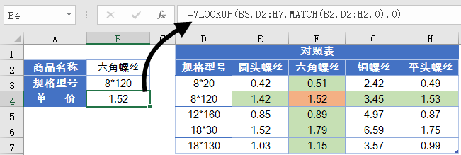 然后使用VLOOKUP函数,以B3单元格的规格型号作为查询值在对照表中查询,再以MATHC函数的结果指定要返回第几列的内容。