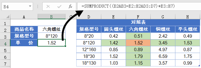 继续看下面的表格,要从对照表中,查询不同物料、不同规格对应的单价。