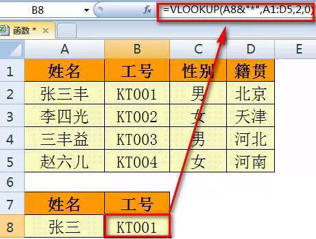 =VLOOKUP(A8&"*",A1:D5,2,0)