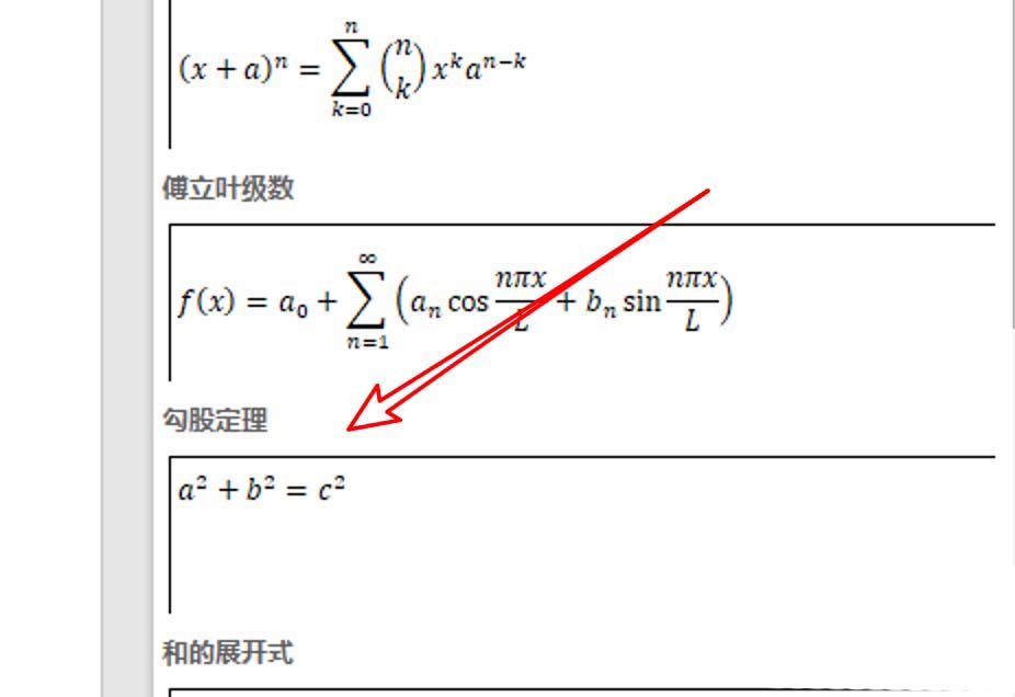 3、在公式下拉菜单里,选择一个常用的公式,比如勾股定理的公式。