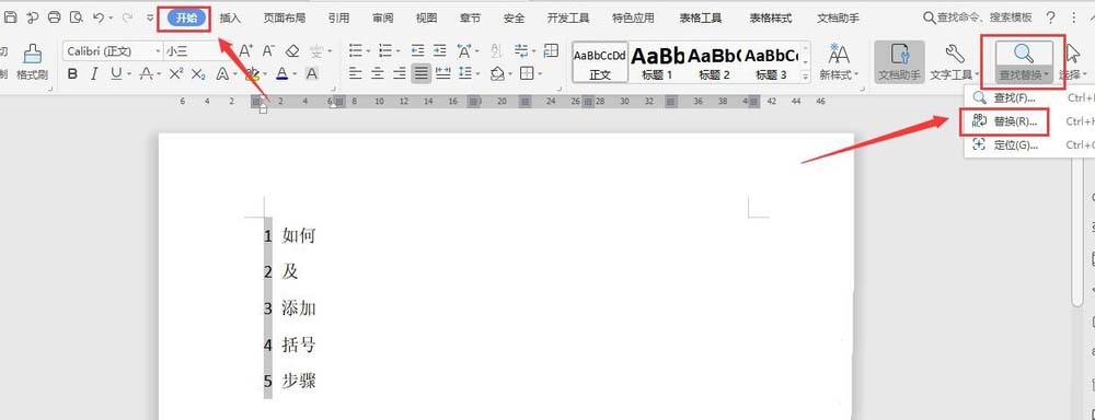 3、点击菜单栏中“开始”按钮,选择“查找替换”,在弹出的下拉选项中,选择“替换”(如下图)
