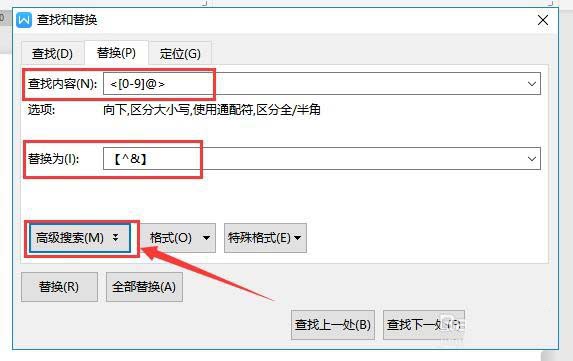 4、在弹出的对话框中,查找内容里,输入“<[0-9]@>”,替换为输入“【^&】”,然后点击“高级搜索”(如下图)