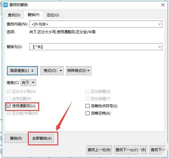 5、在显示的下拉选项中,“使用通配符”选项打勾,然后点击“全部替换”(如下图)