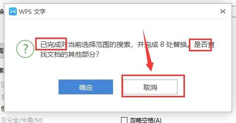 6、在弹出的对话框中,会显示已完成替换,是否需要替换其他的,选择“取消”不替换其他的(如下图)