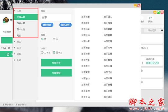 2、弹出随机起名的界面后,首当其冲的就是为你的人物进行起名,其中用户可以选择不同的人物地域类型,包括中国人名、西方人名、日本人民与网名,,你还可以随机选择单姓与复姓,性别与字数也可以进行选择,接着生成名字或生成遵命,大家就可以在右边看到在固定姓氏下所生成的名字,其他类型人名的生成方式则没有什么太大差别,如下图所示: