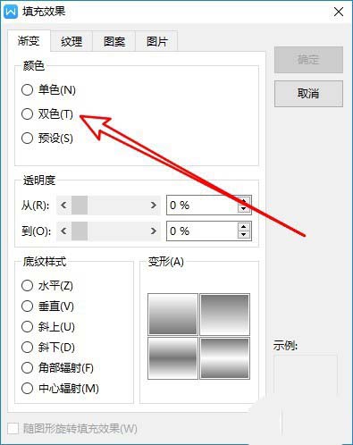 4、这时就会打开WPS2019的填充效果窗口,在窗口中选中双色的选项