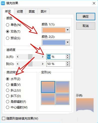 5、接下来我们设置好双色的颜色、透明度以及底纹样式