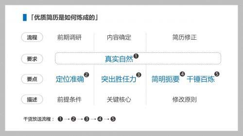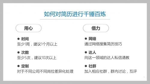 其中,“突出胜任力”是简历制作和修改过程中,最关键的部份;而在最后一个章节“千锤百炼”中,小编将会为大家提供:如何借助外部资源,开启外挂,快速高效地提升简历水准的方法。