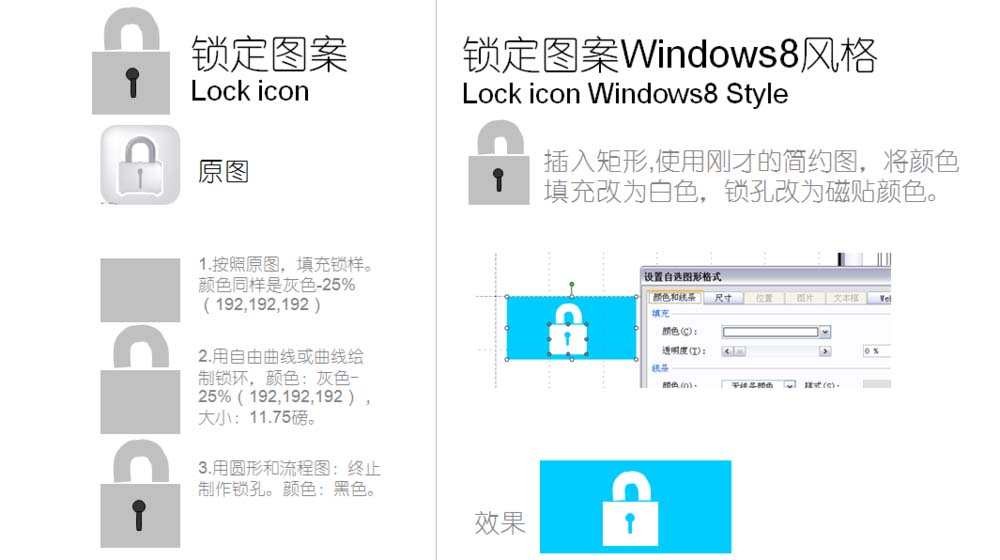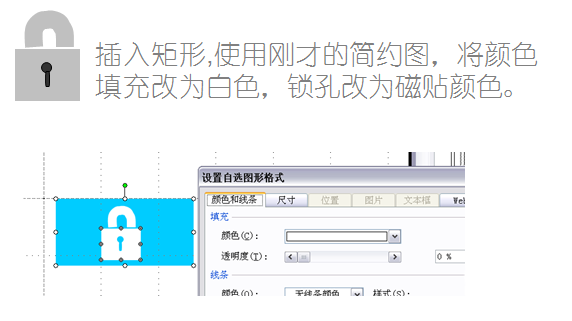 5、插入矩形,使用刚才的简约图,将颜色,填充改为白色,锁孔改为磁贴颜色。
