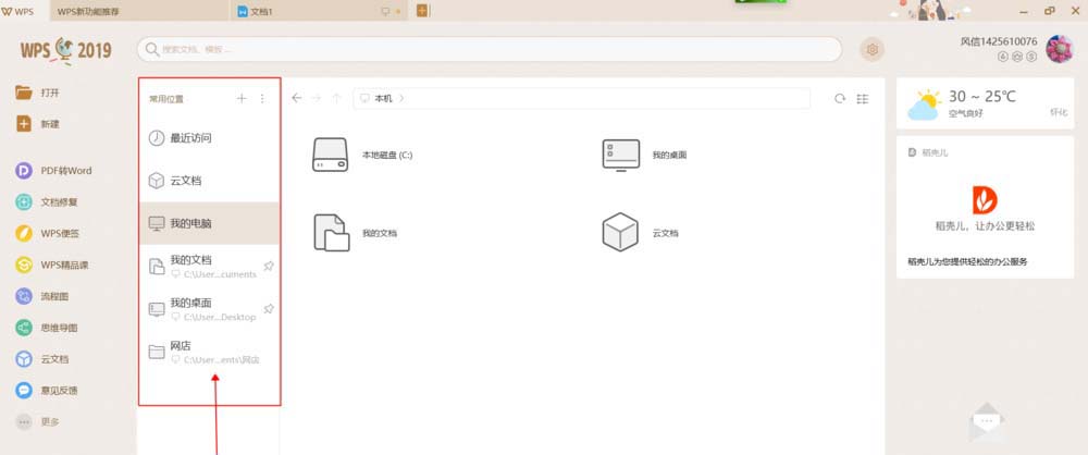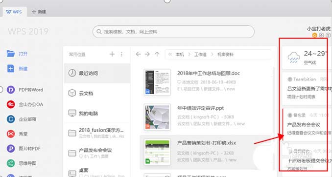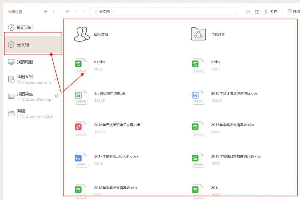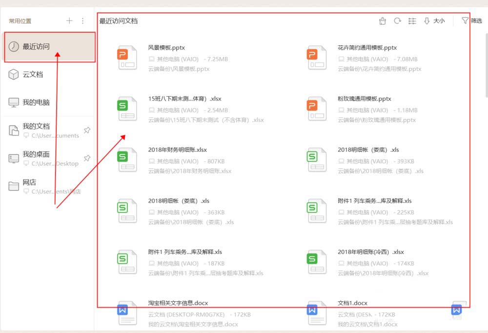 常用位置处可快速搜索云端和本地的办公文档,切换时只需单击鼠标轻点对应的图标,即可快速切换到对应的文档存储位置,如下图所示: