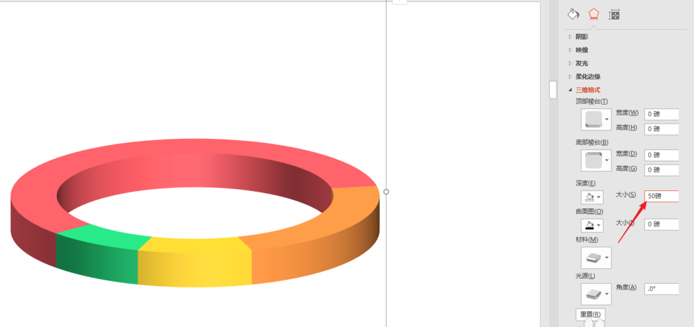 10、接下来,在三维格式中把深度设置一定的数值,就得到了三维格式的圆环。