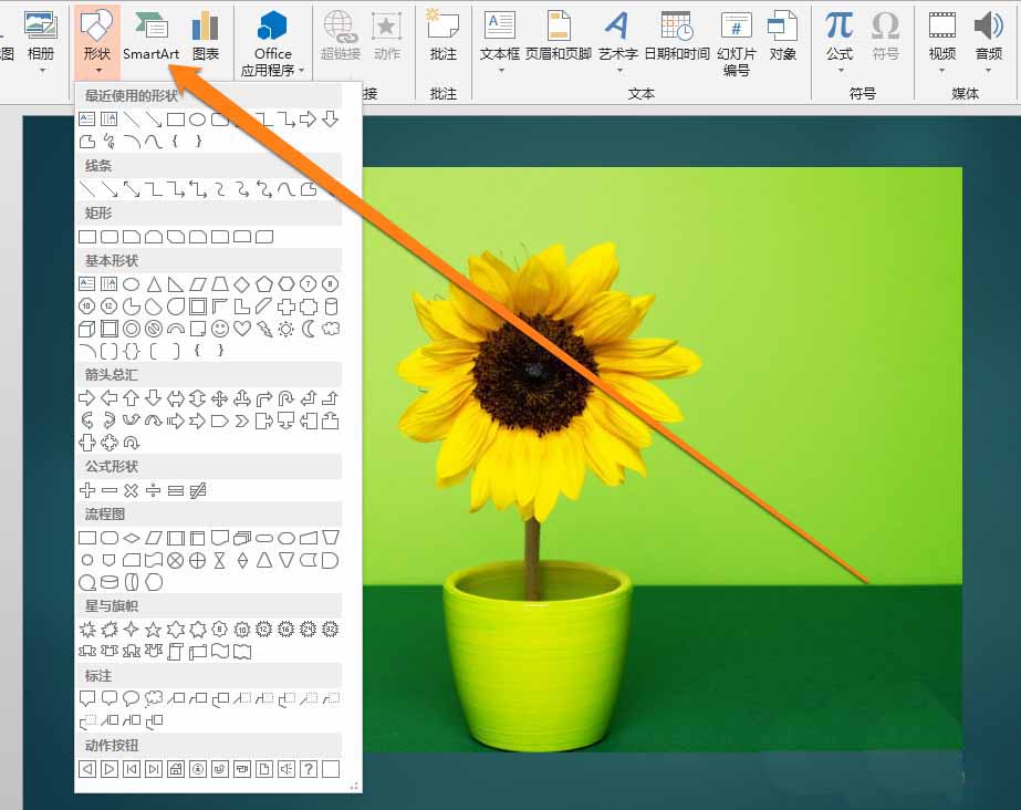 3、点击工具中的插入按钮后,找到插入的形状按钮。