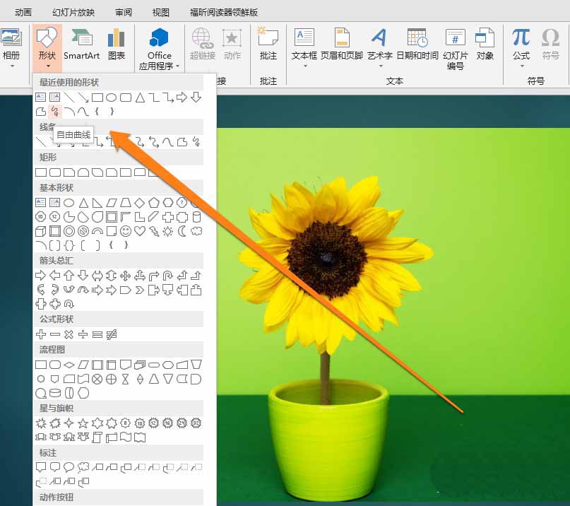 4、在插入按钮的形状工具中,找到自由曲线的图标。